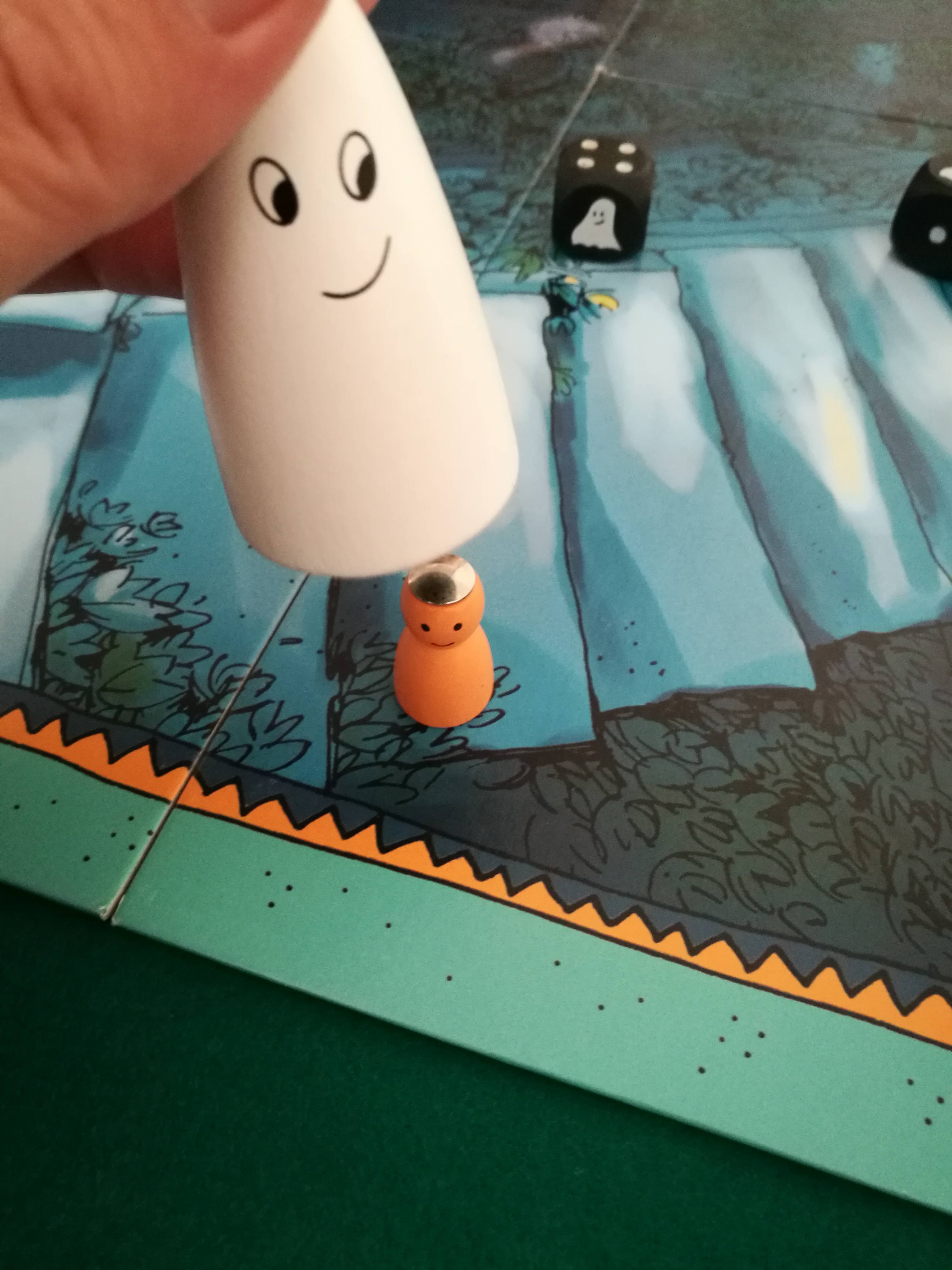 En el juego, los jugadores compiten por ser los primeros en llegar a lo alto de las escaleras y asustar al fantasma que vive allí, pero el fantasma también quiere jugar con ellos y les irá convirtiendo en fantasmas mientras ellos suben las escaleras. los jugadores deberán recordar quien es quien, para poder ganar la partida.